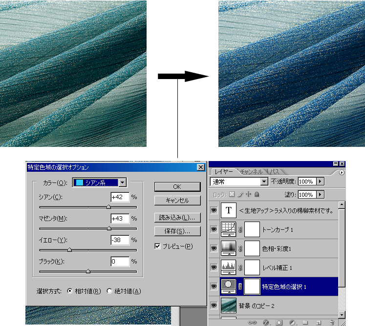 商品の色を変える場合に目視で色を合わせるケースは「特定色域の選択」のレイヤーを重ね、目的の色に近づけます。