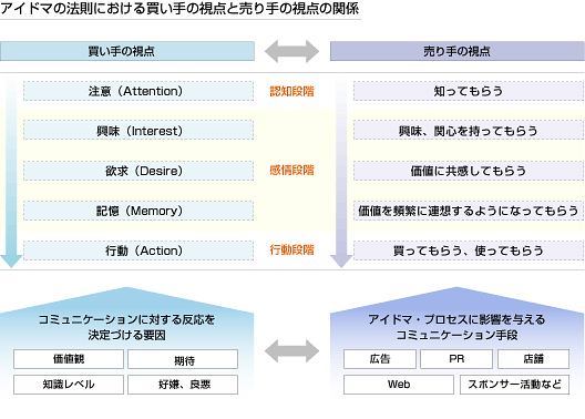 アイドマの法則は、買い手に視点を置いたところが特徴で、これを売り手の視点と対応させると下記のようになります。しかし、当然ながら、価値観や期待、コミュニケーションの基盤となる知識レベルの違う個々人は、同じコミュニケーションを行なった場合でも、それに対する反応が異なります。そのため、アイドマを意識したコミュニケーションでは、そのコミュニケーションが顧客の「認知段階」に影響を与えるのか、「感情段階」に影響を与えるのかという目的の明確化が必要であると同時に、「誰に対するコミュニケーション」なのかというマーケティングの基本とも言えるターゲットの選定が重要な要素となります。
