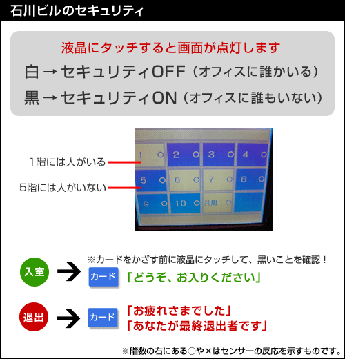 オフィスに1番乗りする人はセキュリティをOFFにし、最終退出者となった人はセキュリティをONにしてください。
