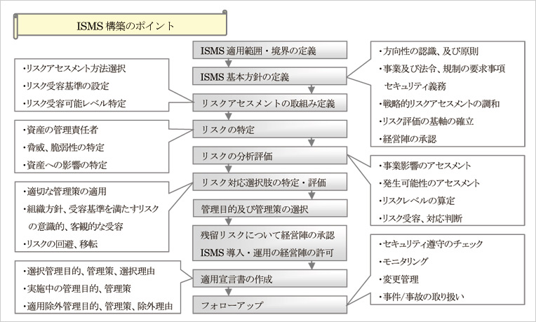 ISMSの構築は、「方針の定義 → リスクの特定・分析・評価 → 管理策の選択 → 経営陣の承認・許可」の過程を経て確立される。また確立されたマネジメントシステムは、PDCAモデルを通して運用、管理されます。