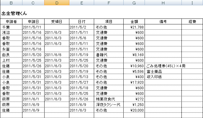 (書き込む項目→申請者、申請日、受領日、日付、項目、金額、備考)