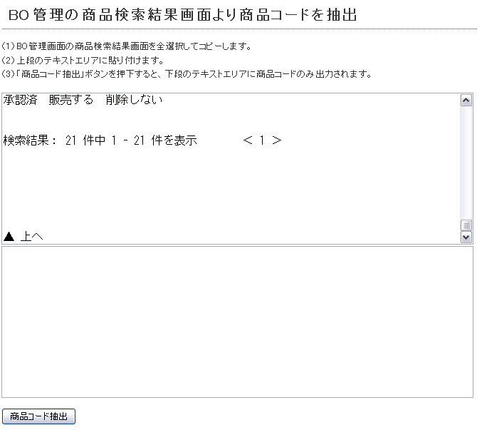 ・「商品コード抽出」ボタンを押下すると、下段のテキストエリアに商品コードのみ出力されます。