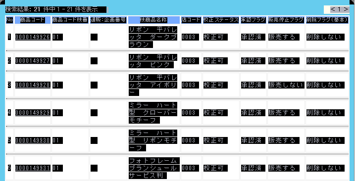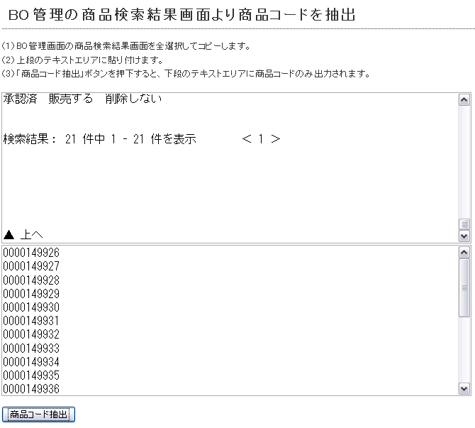 BO管理の商品検索結果画面より商品コードのみを抽出できます。