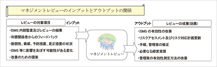 これは、定められた期間において、ISMSの確立及び維持状況、及び情報セキュリティ基本方針において選択された管理策などを点検・評価するものである。また、不適合であると判断された場合は、問題が改善されるようフォローアップを行う事が最も重要となっている。